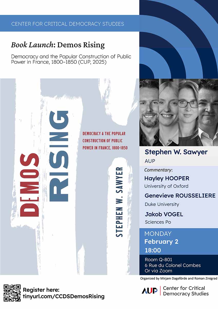 Stephen W. Sawyer is the Ballantine-Leavitt Professor of History and director of the Center for Critical Democracy Studies at The American University of Paris (AUP). In 2020, 2022, and 2023 Sawyer participated in three European Horizon grants, serving as a principal investigator on projects focusing on challenges to contemporary democracy. The core of his multi-volume project articulates a history and theory of democracy as a mode of popular magistrature, administration and public regulation. Sawyer returned to Stanford as the Kratter Visiting Professor in European History in 2022. Sawyer earned his Ph.D. in history at the University of Chicago.