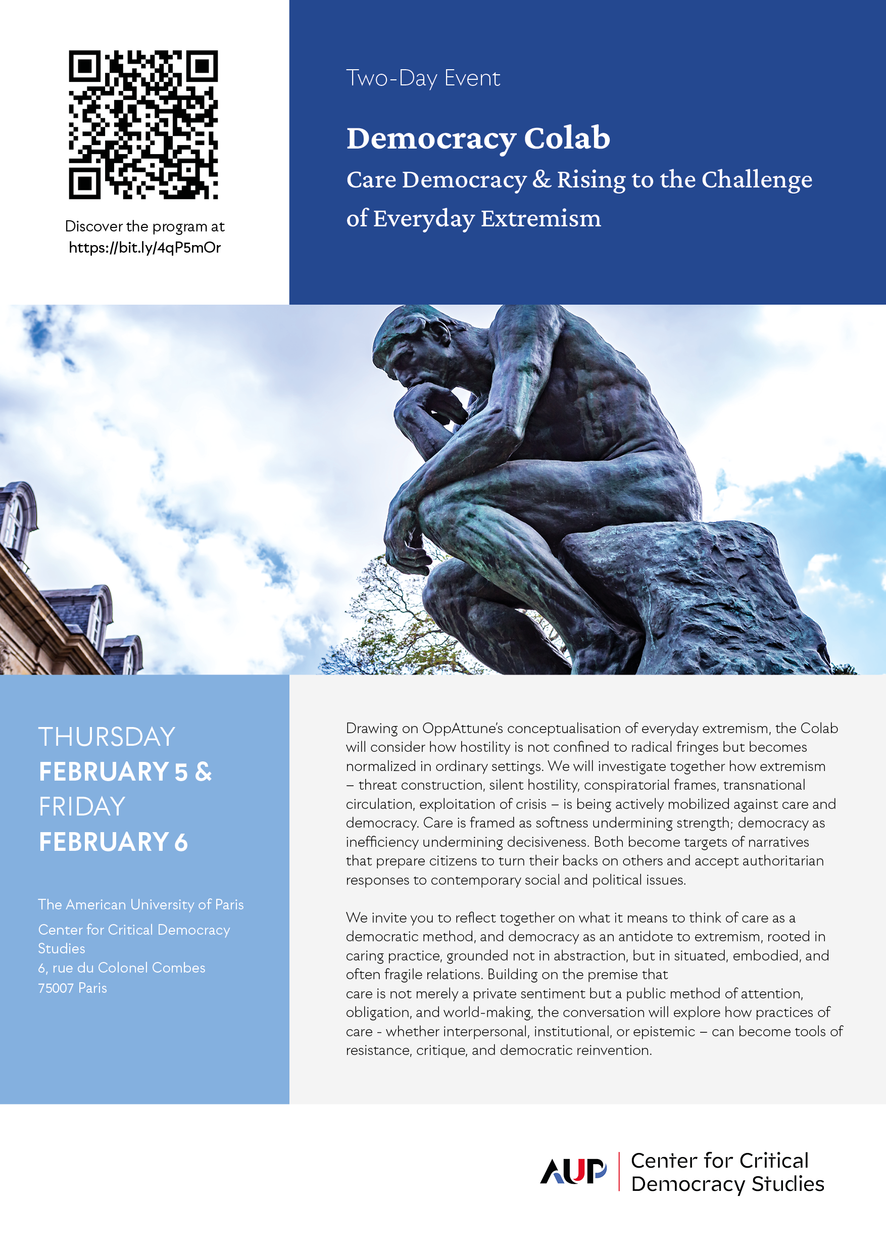 We invite you to reflect together on what it means to think of care as a democratic method, and democracy as an antidote to extremism, rooted in caring practice, grounded not in abstraction, but in situated, embodied, and often fragile relations. Building on the premise that care is not merely a private sentiment but a public method of attention, obligation, and world-making, the conversation will explore how practices of care - whether interpersonal, institutional, or epistemic – can become tools of resistance, critique, and democratic reinvention.