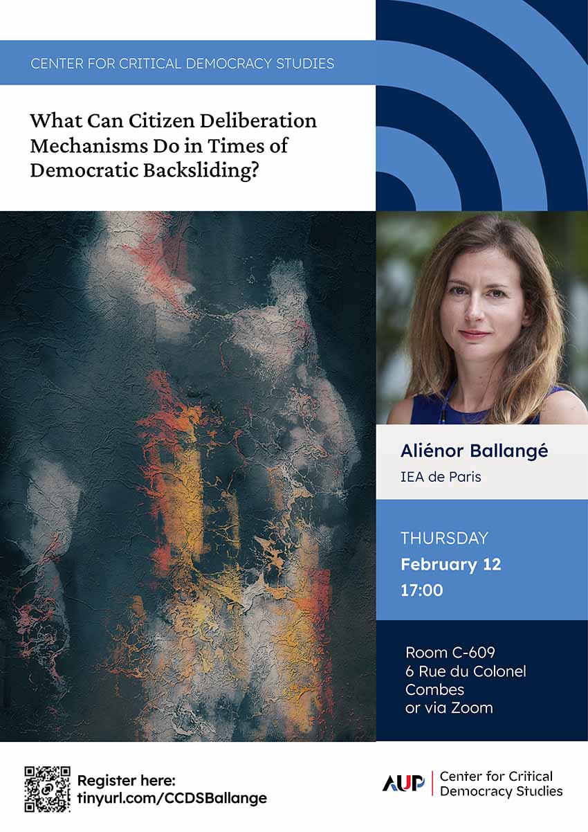 Bio: Aliénor Ballangé received her Ph.D. in Political Theory from Sciences Po Paris in 2018, writing her thesis on the democratic theory of European integration. The thesis won the Prix de la Chancellerie de la Ville de Paris in Political Science in 2019 and the Jean-Louis Quermonne EU Studies Prize in 2020. She was a postdoctoral researcher at the Normative Orders Center at the University of Frankfurt from 2020 to 2025 and a Deakin Fellow at the University of Oxford from 2023 to 2024. Her research combines European studies, democratic theory, and critical theory to analyze the crisis of representative democracy in the EU. Her work has been published in Democratization, Representation, the Journal of Deliberative Democracy, Res Publica, and other publications. In September 2025, she joined the Paris IAS as the "Major Changes" Chair on Europe and Democracy.