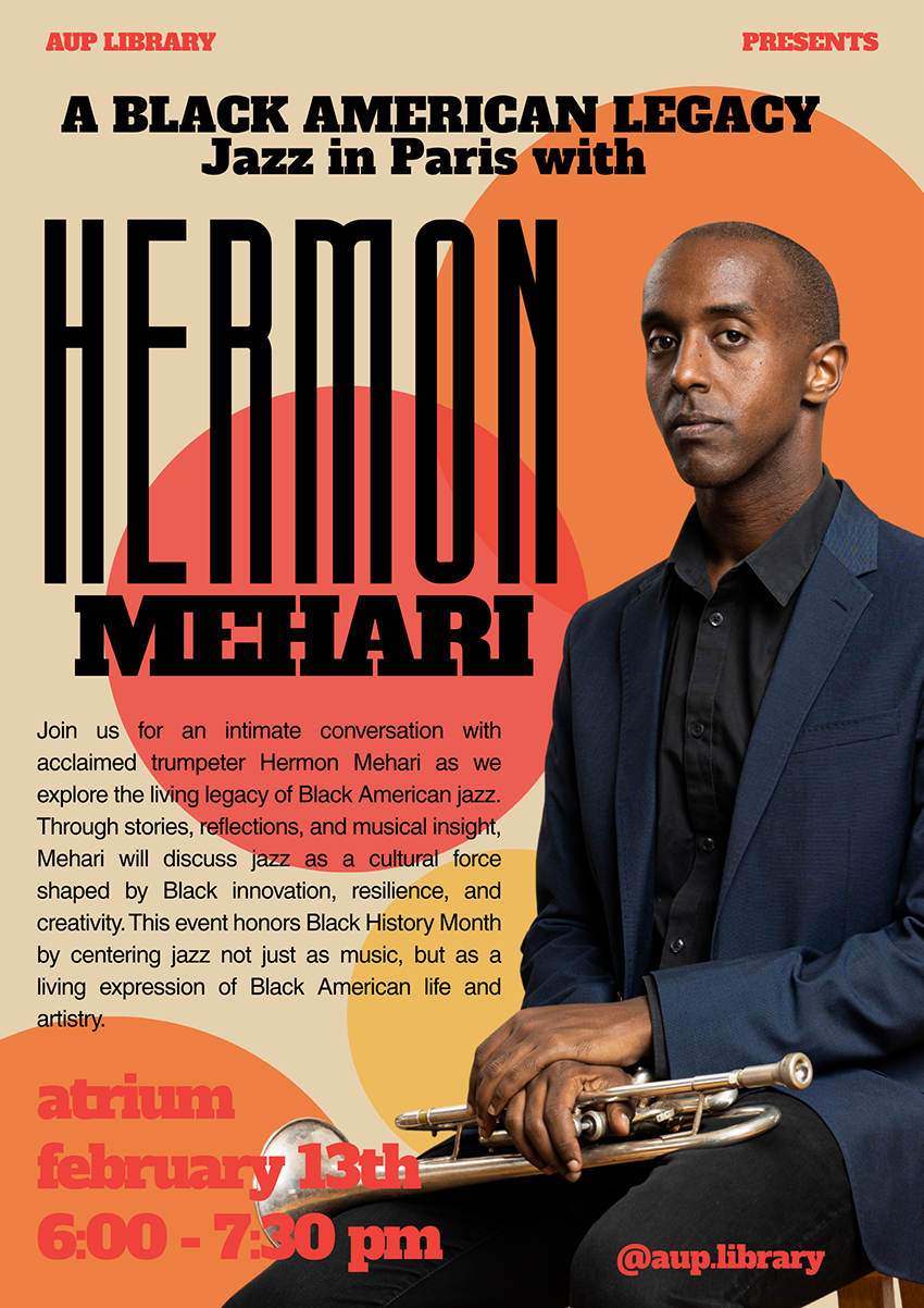 Join us for an intimate conversation with acclaimed trumpeter Hermon Mehari as we explore the living legacy of Black American jazz. Through stories, reflections, and musical insight, Mehari will discuss jazz as a cultural force shaped by Black innovation, resilience, and creativity. This event honors Black History Month by centering jazz not just as music, but as a living expression of black American life and artistry.