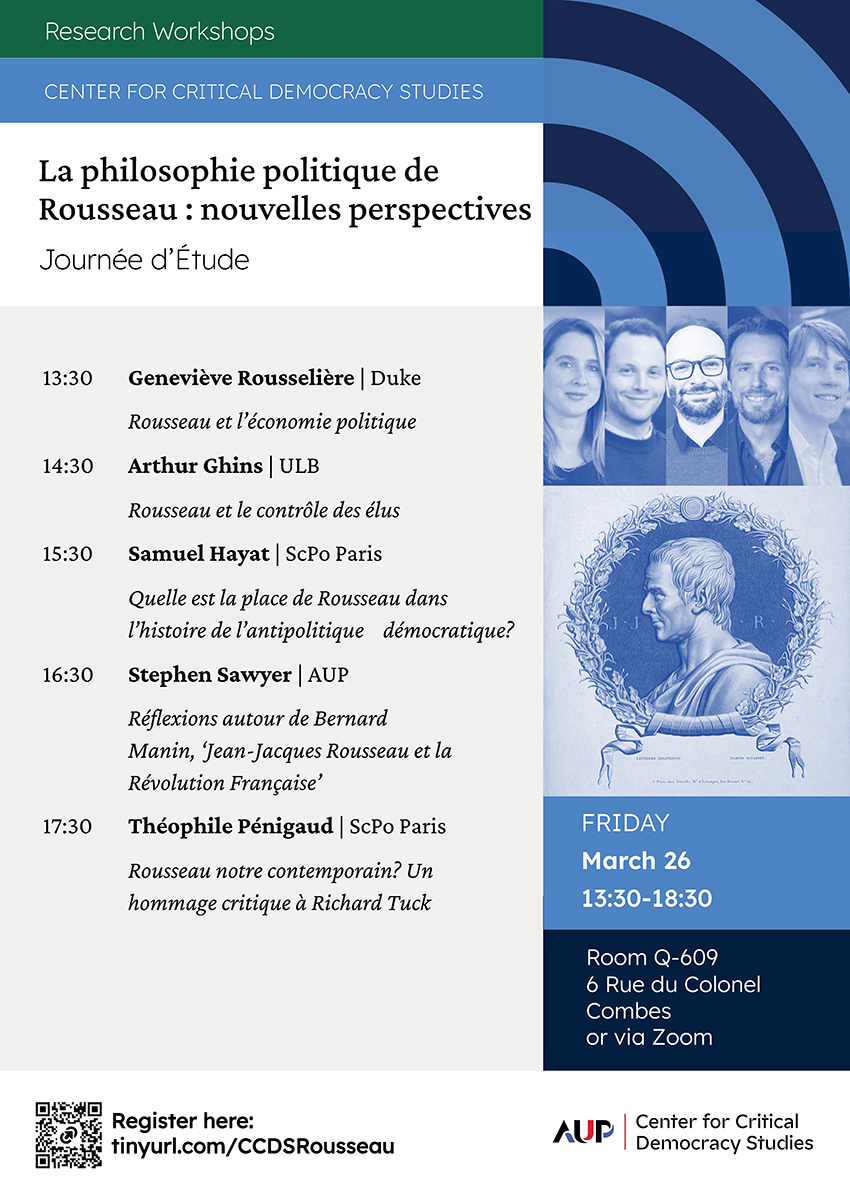 16:30 Stephen Sawyer (AUP), Réflexions autour de Bernard Manin, ‘Jean-Jacques Rousseau et la Révolution Française’