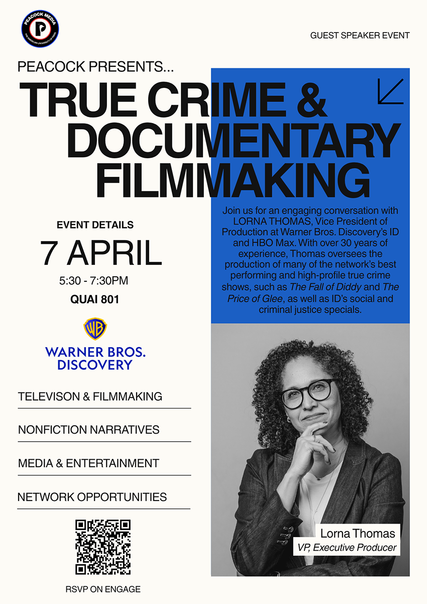 This is a great opportunity to speak with a professional on the front lines of groundbreaking documentary television production. Attendees will learn about nonfiction storytelling, trends in true crime and criminal justice programming, and the evolving media landscape.