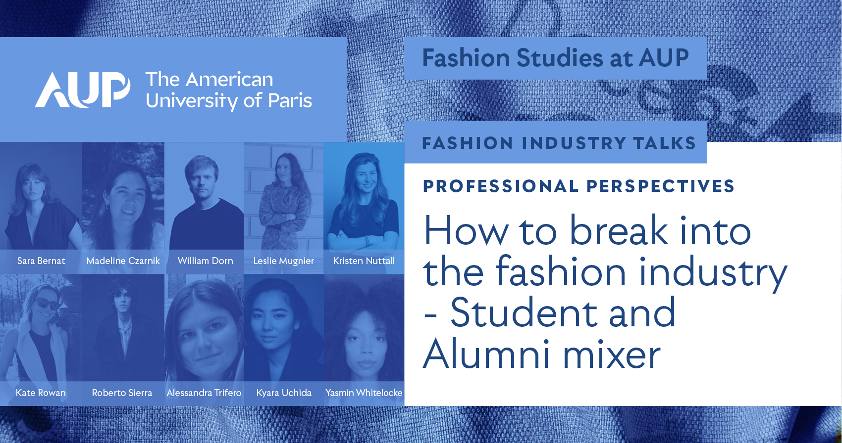 This edition of Fashion Industry Talks focuses on finding ways of working in the fashion industry. Experts from different parts of the professional field of fashion, some of them AUP alums, will talk about their careers and paths into the industry, and the key entry point of internships. Students will have the opportunity to hear and ask about first-hand experience. AUP Alumni are very much invited – creating an opportunity for current and former Fashion Studies students to meet and create connections.